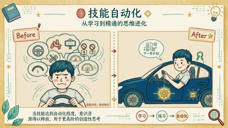 再往日常一点说,自动化技能本身,就是无意识加工最常见的体现。刚学开车时,你全靠意识硬控。方向盘,刹车,后视镜,路况,每一步都得盯着。可一段时间之后,很多动作像自己会了。打字也是。弹琴也是。骑车也是。说熟练的语言也是。这时候,不是你什么都没做,而是很多控制已经被写进了更底层的程序。意识资源被释放出来,你才能把注意力转向更复杂的新问题。