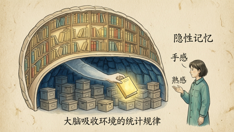 还有一个很关键的点,叫隐性记忆。你以为自己没记住,其实未必。你以为自己不知道规则,其实你的大脑可能已经学会了。比如词干补全实验,比如人工语法学习实验,都说明了一件事:大脑会在你没有明确意识到的情况下,不断吸收环境的统计规律,并在后面用直觉、熟悉感、手感的方式把它们调出来。所以很多人说,自己对某件事说不上来,但就是感觉不对,有时候并不只是空话。那可能是后台真的已经处理出了某种模式,只是前台还没来得及把它翻译成清晰语言。