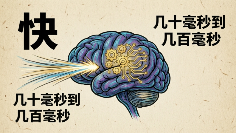 包括语义识别,情绪评估,威胁扫描,习惯动作,自动反应,隐性记忆,还有很多决策之前的预处理。换句话说,无意识加工,不等于心理阴影,也不等于被压抑的欲望。它首先是一种功能现实。那无意识加工,有什么典型特征?三个词就够了。第一,快。很多实验发现,人脑在几十毫秒到几百毫秒之内,就能对看到的东西、听到的词、他人的表情,完成初步分析。你还没来得及意识到,它其实已经在处理了。