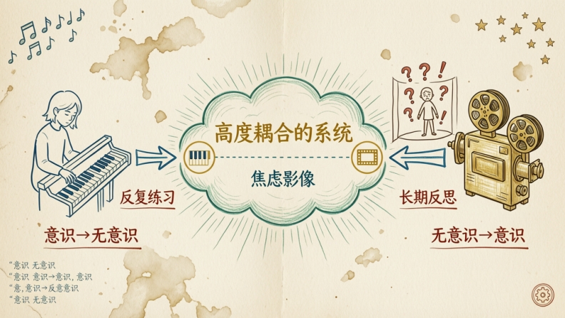 另一方面,意识又会反过来改写无意识。你反复练习一种能力,它会慢慢自动化。你长期反思一种旧模式,做新的选择,有些旧联结就会慢慢松动。你通过训练、治疗、觉察,也可能逐步重写一些老的情绪触发方式和判断偏差。所以,很多生活困境,其实都不是单纯的我不懂道理。而是你的意识知道一套,无意识却还在按另一套老程序运行。
