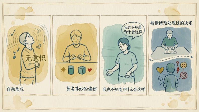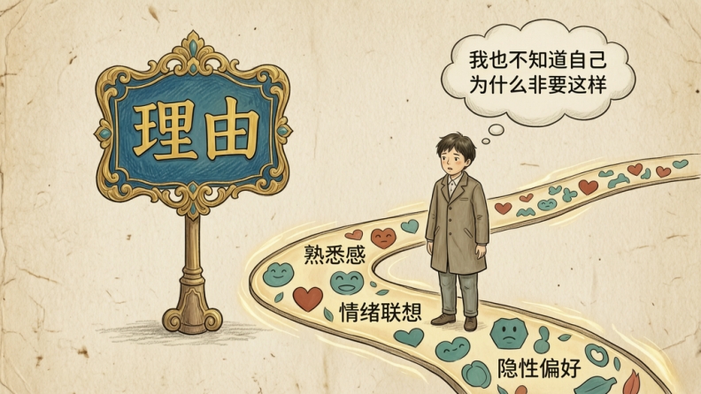 动机也是一样。很多人以为,自己做决定都是深思熟虑的。可研究反复发现,人经常先被熟悉感、情绪联想、隐性偏好推了一下,然后才在事后给这个决定补一个漂亮的理由。这也是为什么,人经常会有一种感觉:我明明说得很清楚,但如果再往深处问,我也不知道自己为什么非要这样。