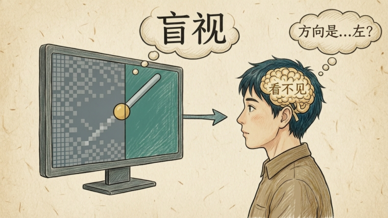 还有一个更有名的现象,叫盲视。有些病人主观上会说,自己某个视野区域什么都看不见。但如果让他去猜一猜那个区域里刺激的方向或位置,他常常能猜得明显高于随机水平。也就是说,他的脑还在处理视觉信息,只是这些信息没有形成完整的主观体验。这很重要。因为它告诉我们一件事:感觉到了和知道自己感觉到了,不是一回事。