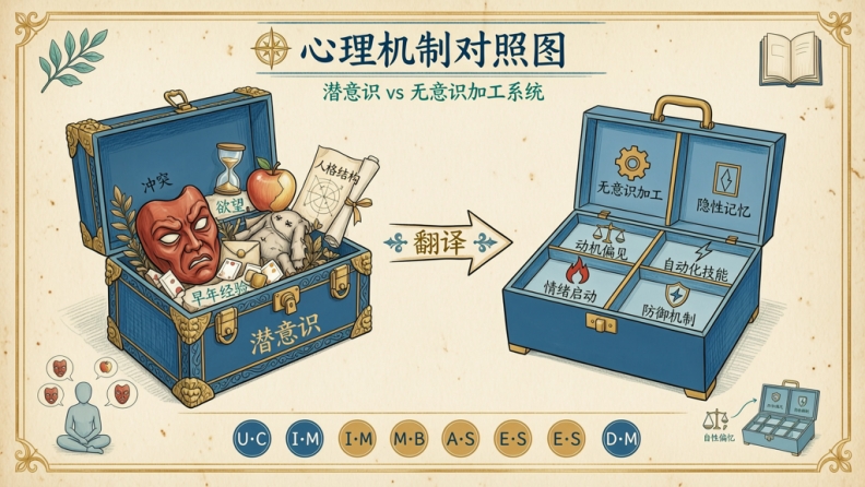 说到这里,就绕不开一个老问题。无意识,和过去讲的潜意识,到底是什么关系?可以这么理解。精神分析传统里的潜意识,更强调深层动力、压抑、冲突、早年经验、人格结构。它给了现代人一套理解内在世界的语言。而当代科学更谨慎,它不太愿意把一切都装进一个大口袋,而是把它拆开来看。拆成无意识加工,隐性记忆,动机偏见,自动化技能,情绪启动,防御机制,等等。