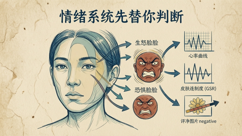 无意识加工,不只影响技能,它还深深影响情绪和动机。比如,有实验会让人看见一张情绪脸,但快到他自己根本报告不出来。可之后,他的心率、皮肤电,甚至对别的中性图片的评价,都会受影响。这说明,情绪系统可以在你没看见的时候,就先替你判断:这个东西,是安全的,还是危险的;是值得靠近的,还是需要提防的。