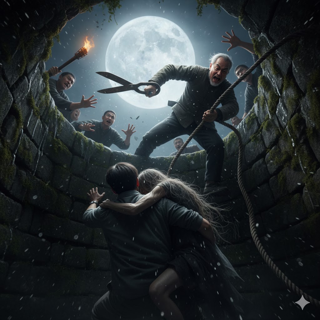 井口上方,村长的声音因为极度的恐惧而变得尖锐变形。火把的光亮照下来,映出一张张扭曲如恶鬼的村民脸孔。
