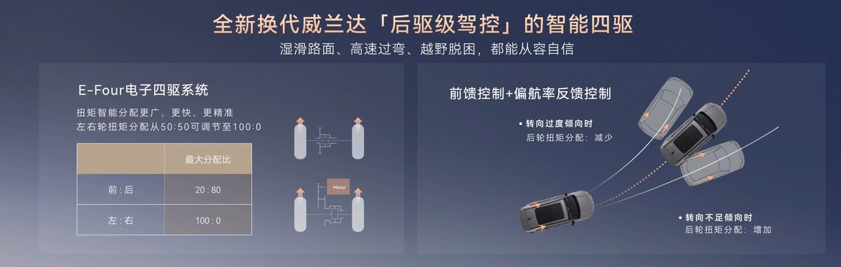 当所有油车发布都在大肆说智能化的当下,换代威兰达重新把少数人提及的机械素质摆上桌面。全新威兰达E-FOUR电子四驱可以罕见实现前后轴驱动力100:0-20:80的智能调节,动力系统通过对四驱系统和悬挂的智能调控,让这台城市SUV在保持舒适的同时,具备了超越同级的操控稳定性和通过性,过弯更灵活、脱困更迅速。应用全新ECB电子控制制动系统,轮上扭矩分配更快更精准,大幅优化侧倾控制,实现了更线性跟脚的制动脚感,显著缩短制动距离,过弯更稳。
