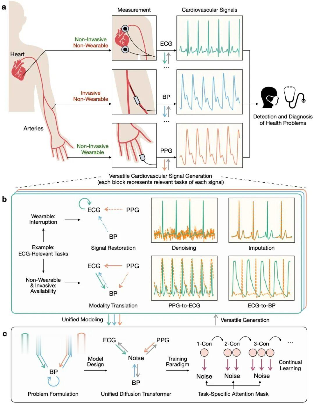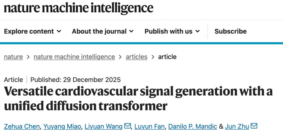可穿戴健康监测信号由于监测难度高、观测噪声大、易受干扰,高质量的心血管信号仍难以长期便捷获取,这是智能健康监测系统始终面临的现实困境。近日,清华朱军等团队提出了一种统一的多模态生成框架 UniCardio,在单扩散模型中同时实现了心血管信号的去噪、插补与跨模态生成,为真实场景下的人工智能辅助医疗提供了一种新的解决思路。相关工作《Versatile Cardiovascular Signal Generation with a Unified Diffusion Transformer》于 2025 年 12 月 29 日在 Nature Machine Intelligence 正式上线。