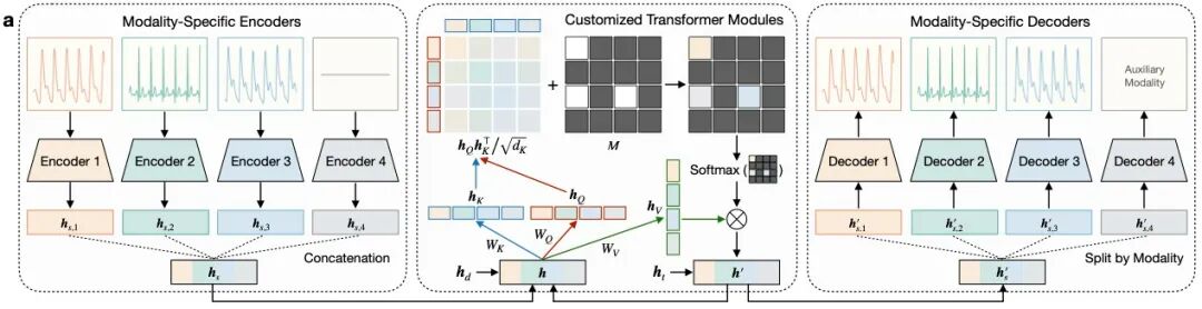 为了同时处理多模态、多任务,UniCardio 为每个模态配置了模态专用的编码器与解码器,以提取和还原具有生理意义的波形特征;另一方面,在 Transformer 的注意力计算中引入任务特定注意力掩码,用于显式约束信息流,只允许与当前任务相关的条件模态到目标模态的交互,从而减少无关模态或无关方向的信息干扰,使不同任务能够在同一网络中被稳定表达与联合学习。