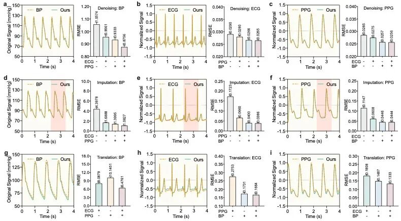 论文在多项代表性任务中表明:在仅使用单一条件模态时,UniCardio 已能达到或超越相应的任务特定方法相当。而在进一步引入额外条件模态后,生成误差可显著降低,波形恢复的稳定性也随之提升。例如,在 PPG 与 ECG 插补任务中,引入多模态条件后,生成误差下降至原来的三分之一量级;在 PPG→ECG 等跨模态生成任务中,UniCardio 在参数规模远小于部分生成基线的情况下,依然取得了更优或更稳健的结果。