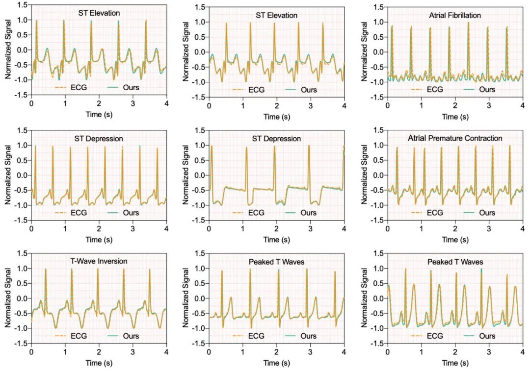在可解释性方面,这项工作也给出了相对临床友好的论证路径。生成结果不仅追求误差数值的降低,还尽可能保留可被临床专家识别的诊断特征。论文通过可视化展示多类典型 ECG 异常形态在生成信号中的复现情况,并结合临床评估验证其诊断特征的一致性,表明生成信号在形态层面能够与真实生理信号保持良好对齐。只有当生成结果能够被专家识别、理解并用于判断,模型才有可能被谨慎地纳入真实医疗工作流。