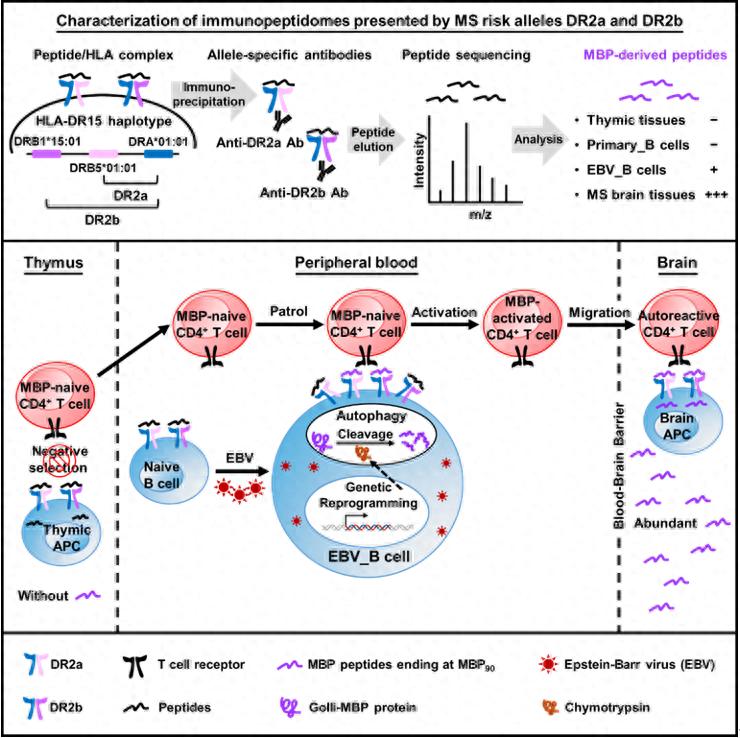 中国科大团队最新研究揭示,EBV感染和HLA-DR15基因型共同驱动多发性硬化症发生的新机制。