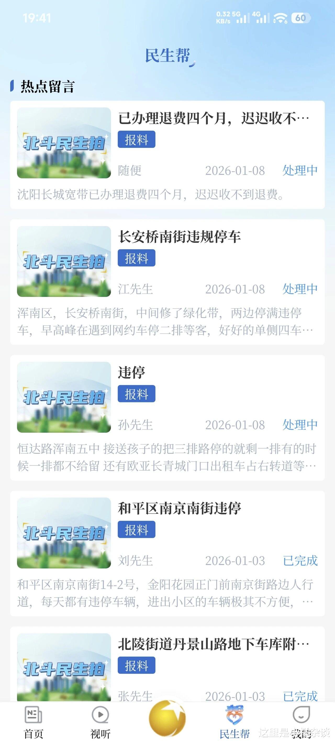 沈阳的违停车辆可能出现在人行道上压盲道,可能出现在公交车港湾站影响公交车正常进站,可能出现在绿化带里碾压草坪。“随手拍”没有啥效果,现在又推出了一种新的方式来反映违章停车。这就是北斗融媒APP,它是由辽宁广播电视台开发的融媒体客户端,它本来的用途主要是通过图文、视频、直播等方式展现辽沈方方面面,现在它推出了一个问题反映板块—北斗民生拍,在这里可以反映各种民生问题,有反映宽带退费问题的,也有反映违章停车问题的。