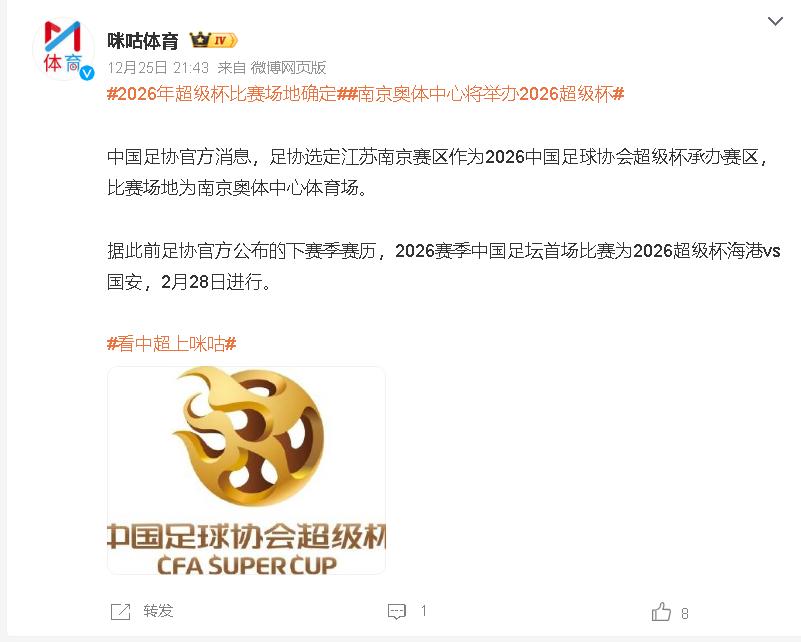 最近中国足协一纸公告点燃了全国球迷的热情,2026中国超级杯正式落户南京奥体中心!这场由中超冠军上海海港对阵足协杯冠军北京国安的巅峰对决,不仅是新赛季中国足坛的“开年大戏”,更因两队的历史恩怨和南京的“福地属性”,让这场比赛未战先火!为什么选择在江苏南京,对上海海港十分有利,对北京国安极不利,真是如此吗?