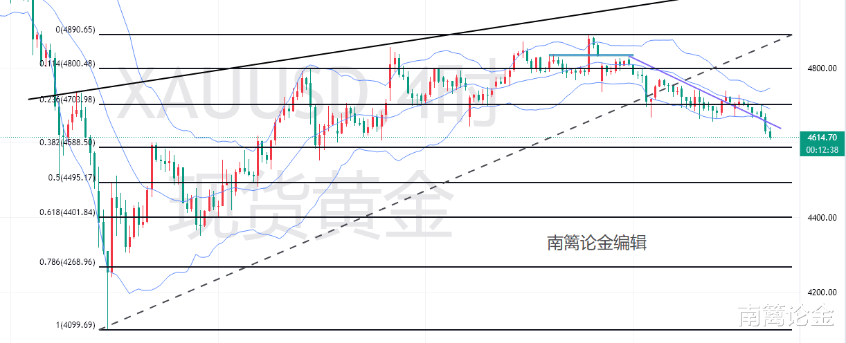 技术面的走势,这两天直播和文章里我反复跟大家强调,4月末会出现阶段性低点,周初以震荡整理为主,核心关注前低4657的破位情况,一旦失守,必然向下测试4620~4630区间。