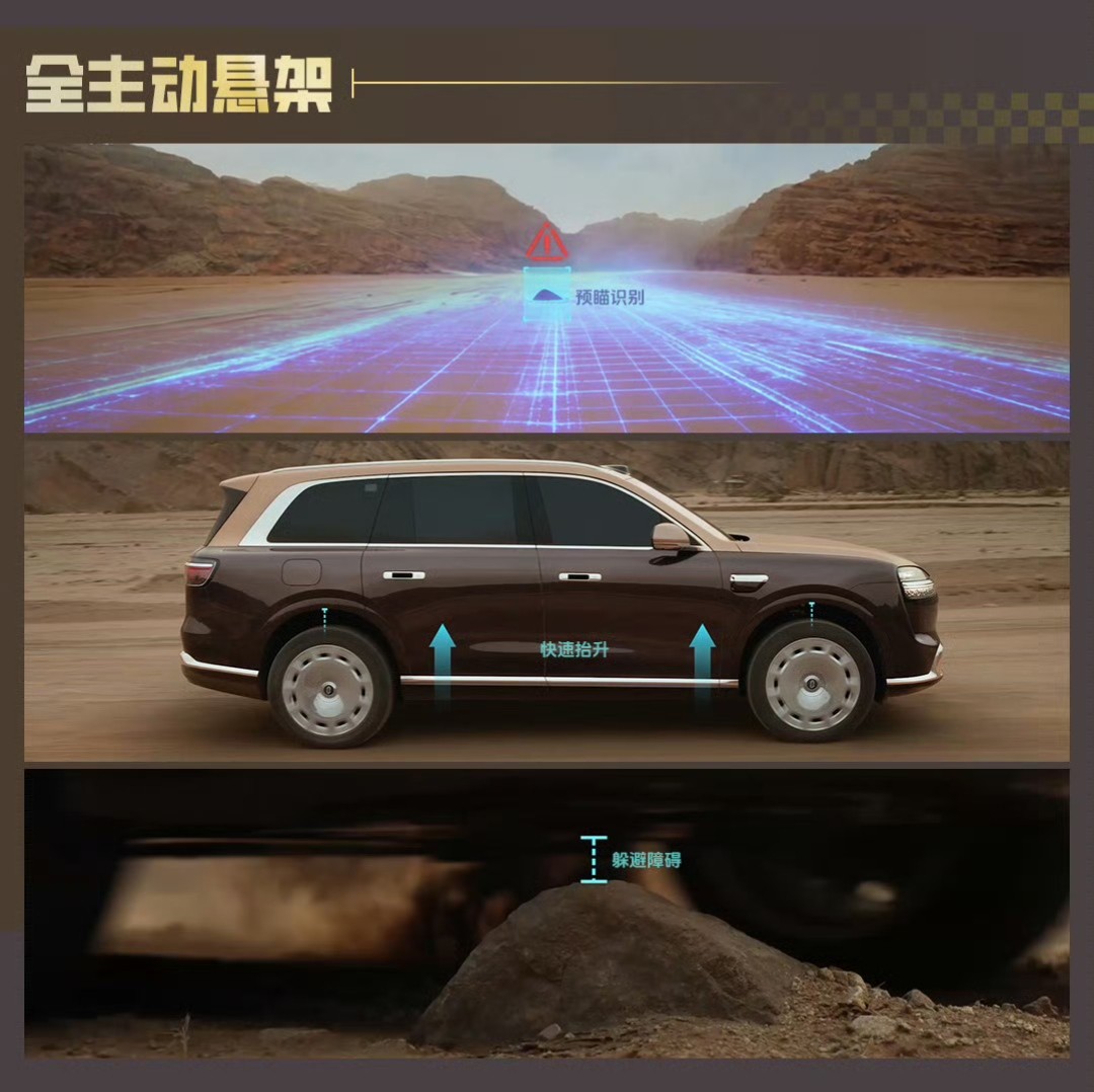 底盘部分,新款M9是鸿蒙智行首款搭载了全主动悬架的车型。这套悬架可根据路况实时自动调节刚度与阻尼,配合预瞄识别、快速抬升功能,能主动预判并规避路面障碍,大幅提升行驶舒适性与通过性。再加上12°后轮转向,车身虽然接近5.2米,但转弯半径只有5.8米,小区里掉头、窄路会车都很灵活,开起来不会觉得笨重。