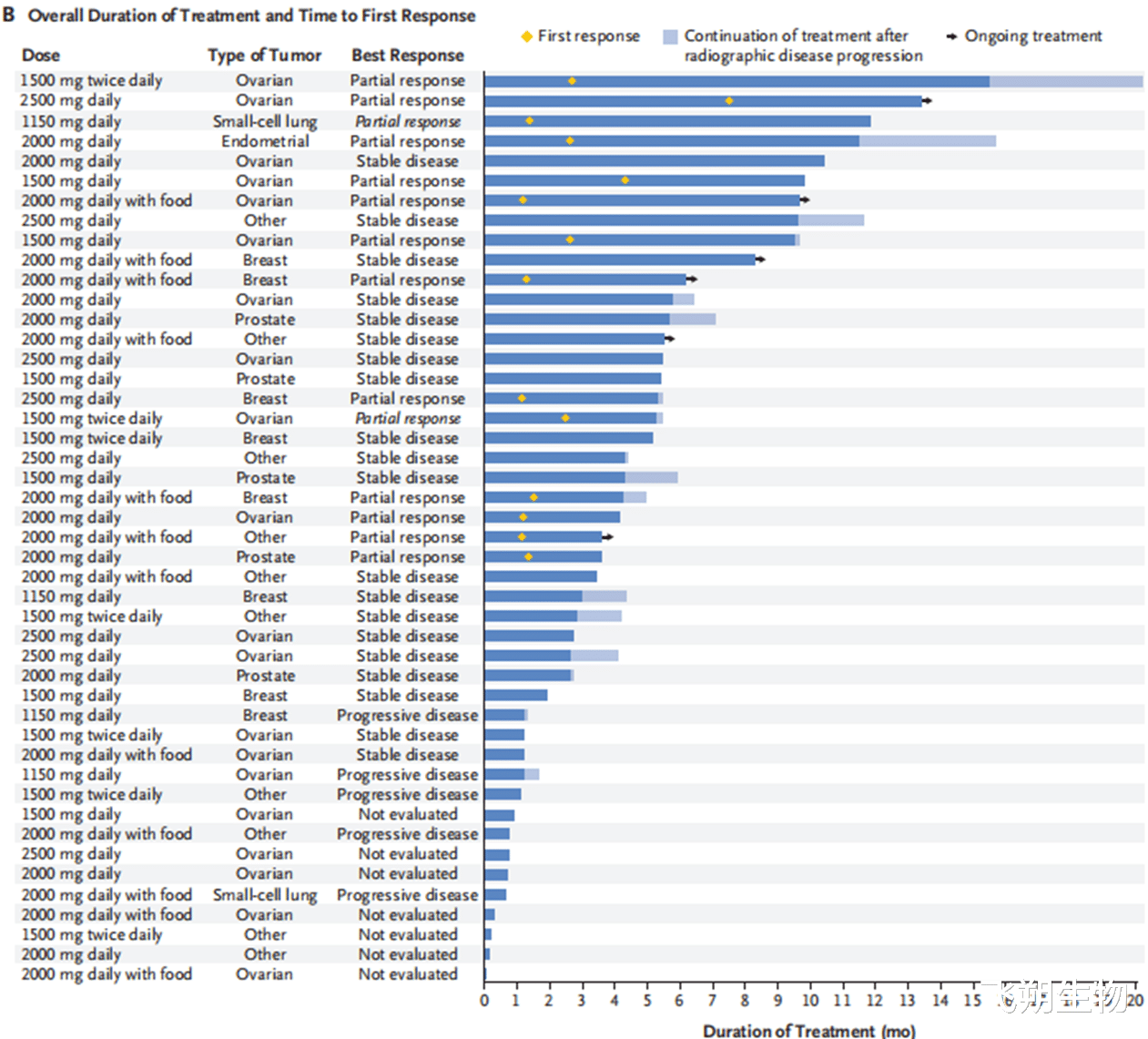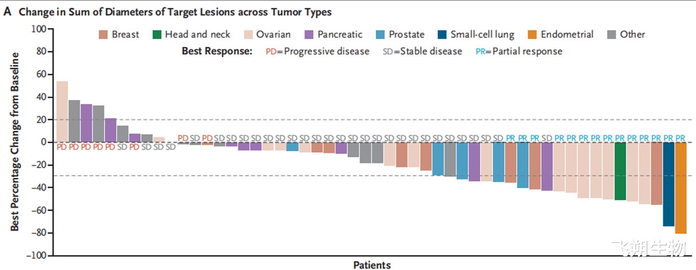 注:从患者肿瘤病灶变化的图表中可以看到,大部分患者的靶病灶尺寸相比治疗前有所缩小(条形图大部分位于0%以下),但反应类型各异,包括疾病稳定、部分缓解以及疾病进展。