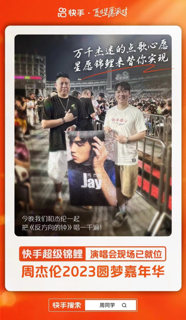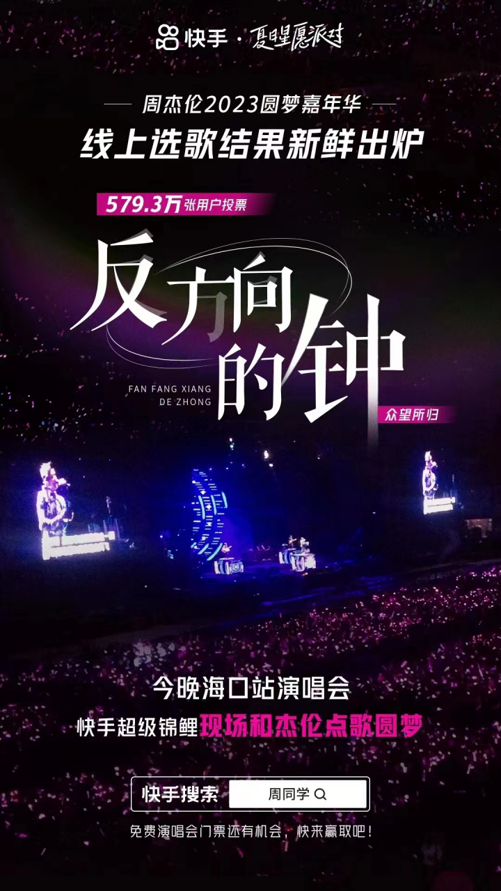 6月20日,快手平台正式上线了名为「周杰伦2023圆梦嘉年华」的活动,参与活动赢周杰伦演唱会门票的同时,更有超级锦鲤专享点歌特权。周杰伦本人也在快手发布视频喊话粉丝朋友来做演唱会的锦鲤,在偶像的号召下,千万粉丝涌入平台参与活动,在“线上选歌投票”中,《反方向的钟》稳居票选榜第一。