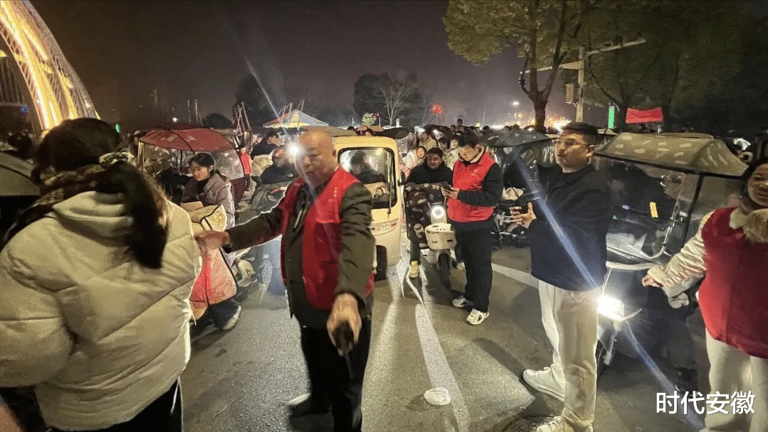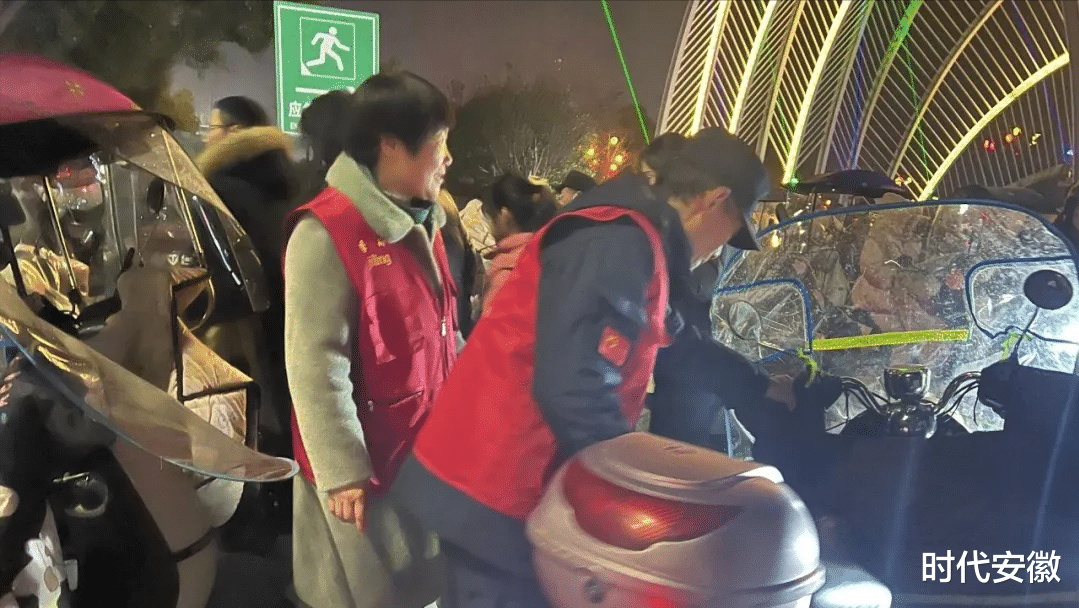 另一边,非机动车停放区的志愿服务同样紧张有序。随着观演群众增多,电动车、自行车源源不断驶来,若停放混乱不仅影响通行,还存在安全隐患。志愿者们分工协作,有的引导车辆有序驶入指定区域,有的帮忙整理摆放杂乱车辆,有的提醒车主锁好车辆、保管好随身物品。寒夜中,他们的身影在车流间穿梭,一遍遍弯腰挪动车辆,一遍遍重复引导话语,即便双手冻得发红,脚步依旧不停歇。有车主感慨:“多亏了这些志愿者,不然这么多车真不知道往哪放,看得舒心,停得也放心!”