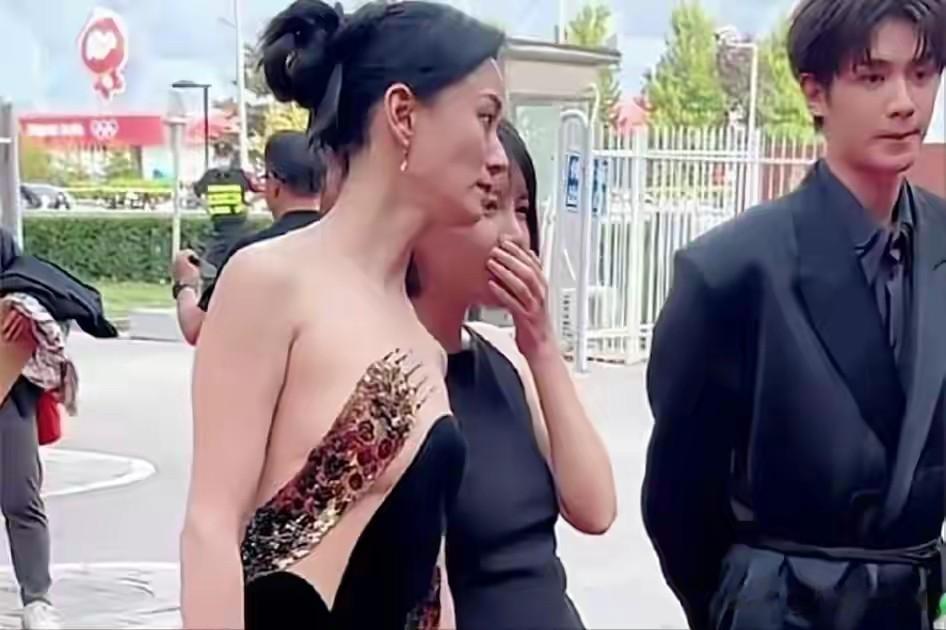 倪虹洁出席活动时,直接来了个上衣消失术,胸前仅仅用了两块布勉强挡住。