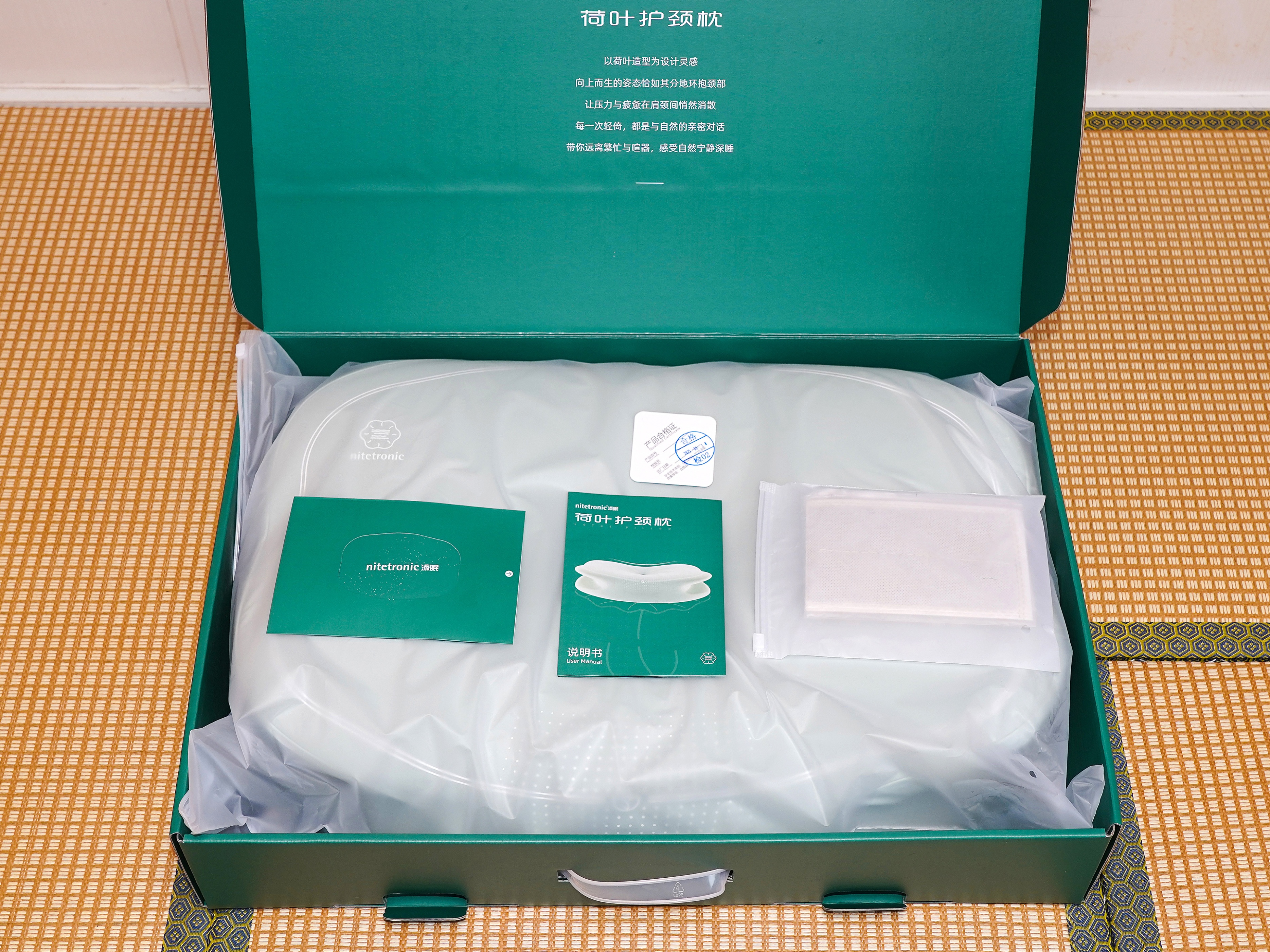 ▼取出护颈枕,中间微微内凹,外观设计得很舒缓,确实有点像个荷叶,而且尺寸也比较大,为580X450X100mm。从功能上看,枕头分成了5个区域:中间是脑窝承托区,上面为8cm高的低枕区,下面为10cm高的高枕区,左右两侧为侧睡支撑区。