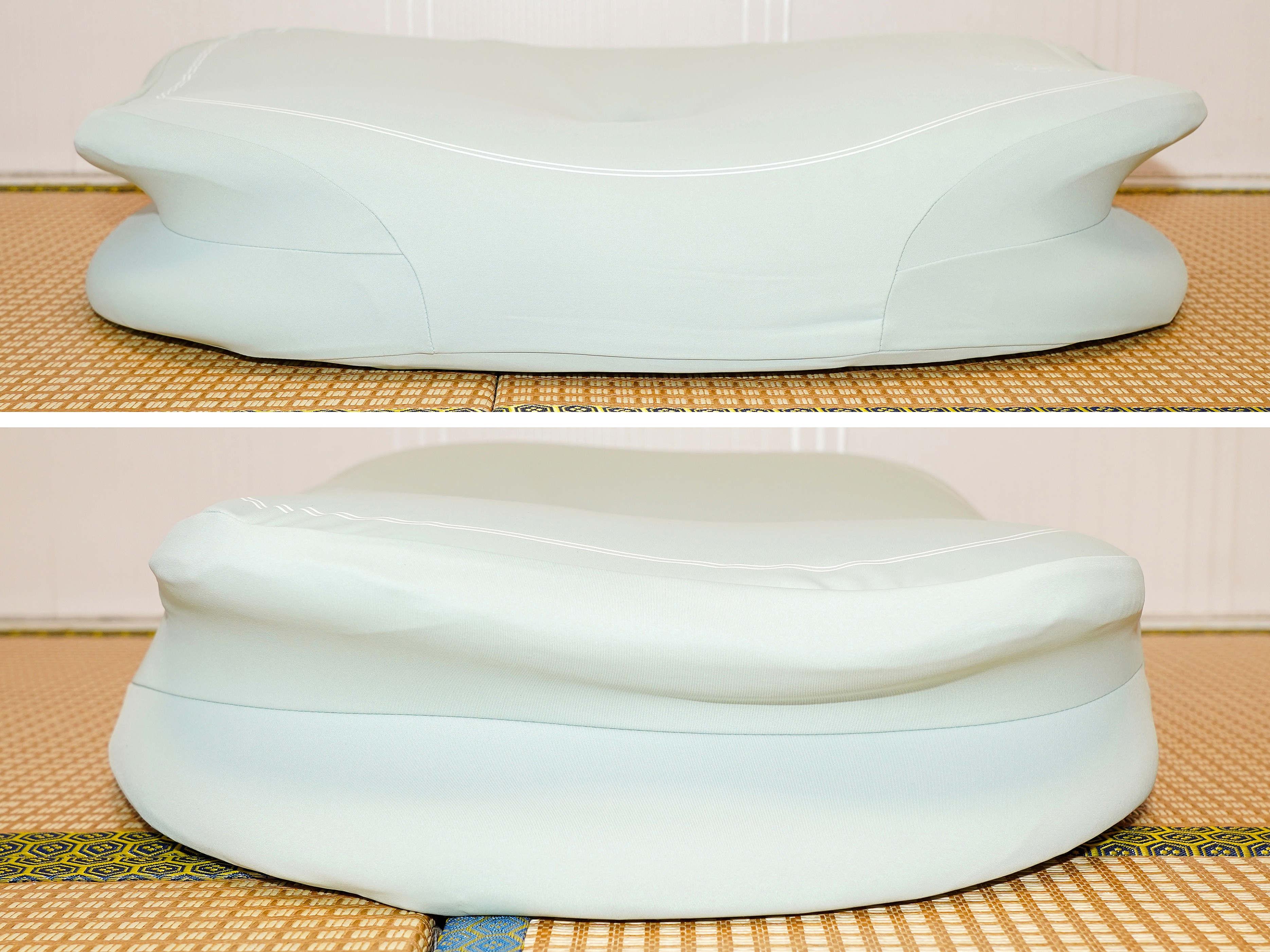 ▼可以看到通过充气,把枕头的高低落差变得更大,在高枕区可以得到更好的颈部支撑,而在高枕区充满气时,使用低枕区则可以得到更适合看书玩手机的角度。