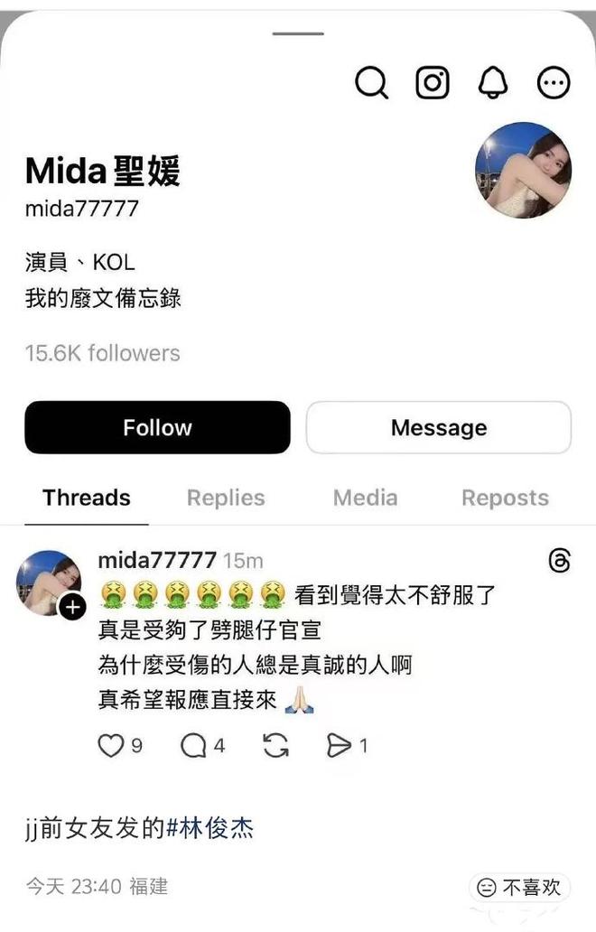 也就是在粉丝们纷纷在评论区刷“恭喜JJ”“终于等到你”的祝福时,社交平台突然流出一则劲爆发声:一位账号名为“曾圣媛_”的用户(被网友指认为林俊杰2018年的绯闻女友)在外网连发多条动态,语气愤怒又委屈,先是用6个呕吐表情包表达不满,随后直接开怼:“看到劈腿仔官宣真的生理性不适,受够了这种满嘴谎言的人!为什么受伤的总是真诚付出的人?真希望报应能早点来,别让坏人逍遥快活”。