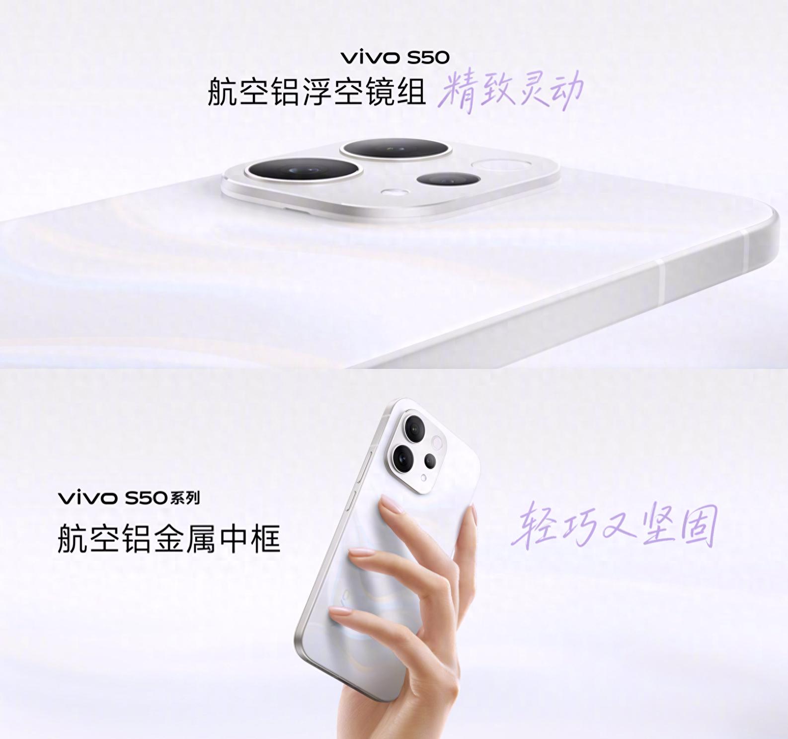 细节处,则藏着设计师的“炫技”小心思。镜头模组的“浮空岛”设计,通过航空铝材质与高亮倒角的结合,在特定角度会折射出一线如珠宝切边般的锐利光泽,瞬间点亮整体设计,旋即又归于内敛。这种刹那的闪耀,是整机设计语言的“诗眼”。整体看下来,vivo S50完全没辜负S系列的年轻化基因,“告白美学”不是空谈,从握感、光影、配色,每一处都藏着用心。颜值与质感双在线,手感还这么能打,颜值党闭眼冲就对了!