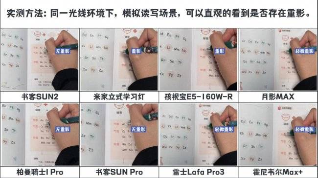 最后则是重影比较严重的米家立式学习灯、孩视宝E5-160W-R;实际重影明显,在一定程度上影响视觉清晰度,同时可能造成视觉压力。