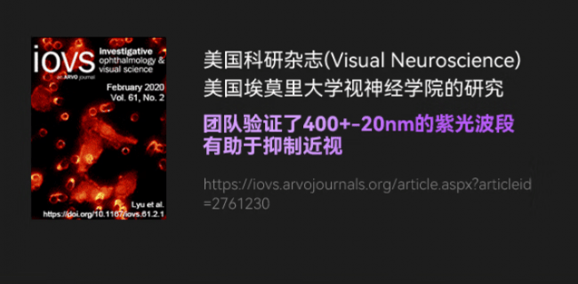 紫光激发不仅覆盖有益的可视紫光波段,还能促进眼睛自我修复能力,研究表明,400~420nm的可见紫光在《Visual Neuroscience》和《柳叶刀》相关医学论文中均被证明,有助于近视预防。