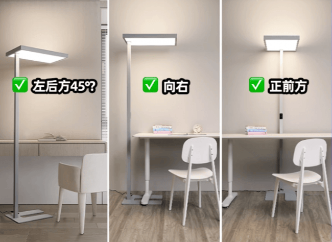 大路灯的摆放主要还是根据家里的空间布局来决定,毕竟光照范围很广,前后左右差别不大,右侧可能会有手影,正后方不建议放因为会背光影响学习,但沙发或特殊情况除外,只要不会背光的位置都可以放。