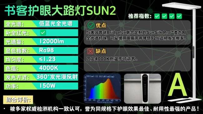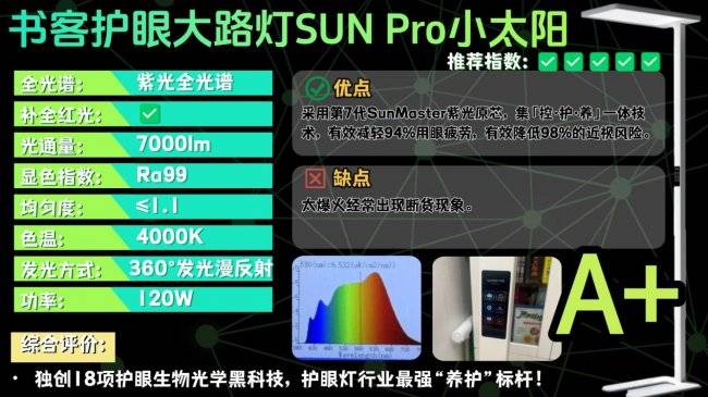 首先是第一梯队的书客SUN Pro、柏曼骑士I Pro;这两款均为紫光激发全光谱,在控制蓝光以及光谱连续性上自然不用多说,蓝光峰值在0.4左右,同时光谱十分接近自然光,实际光线舒适具备一定的护眼性,特别是书客SUN Pro,这款护眼大路灯的实测表现让我非常惊喜,所以对此我也深挖了一下,原因是因为它是一款采用第7代SunMaster紫光原芯的护眼大路灯,通过搭载「控·护·养」一体紫光激发技术,从光源上抑制60%的有害蓝光含量,并自研RRT红光2.0养眼技术,科学增加650nm有益红光,全面均衡光谱看,实现有效还原99.8%自然光,并有效缓解94%视觉疲劳以及减少98%的近视风险。