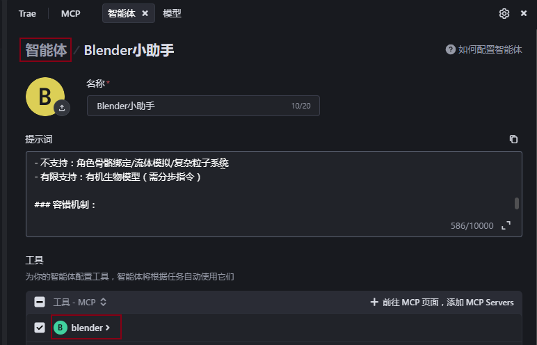 打开 TRAE 的智能体,自定义名字,工具勾选 “blender”,提示词可以参考我下面的。