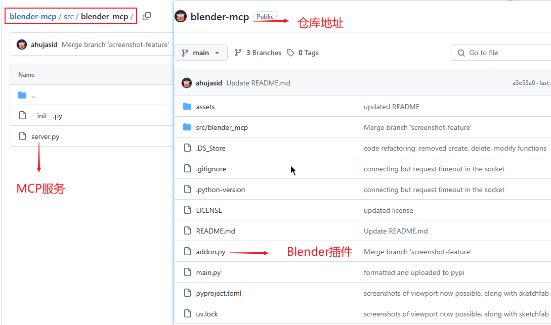 提示:下载整个项目后,只需要复制根目录下 addon.py (Blender 插件),用于在 Blender 中插件安装,另一个 Server.py 也可以下载单独部署(最好直接用 TRAE 中 MCP 插件市场的)。