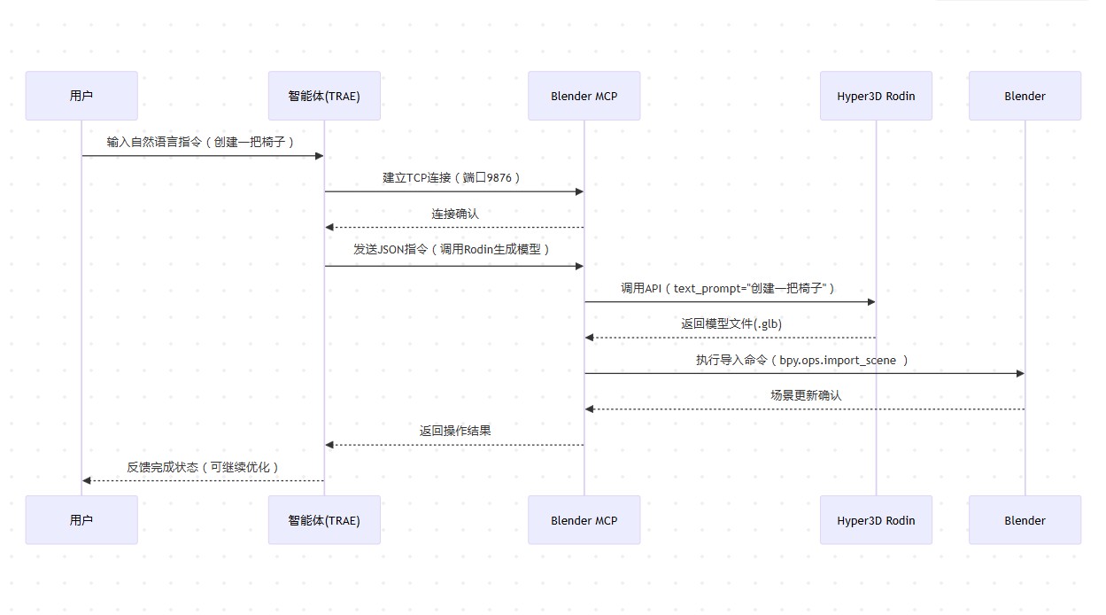 用户向智能体输入自然语言指令(如 "创建一把椅子模型并导入 Blender"),智能体通过 NLP 模型解析意图,判断是否需要调用 Hyper3D Rodin。