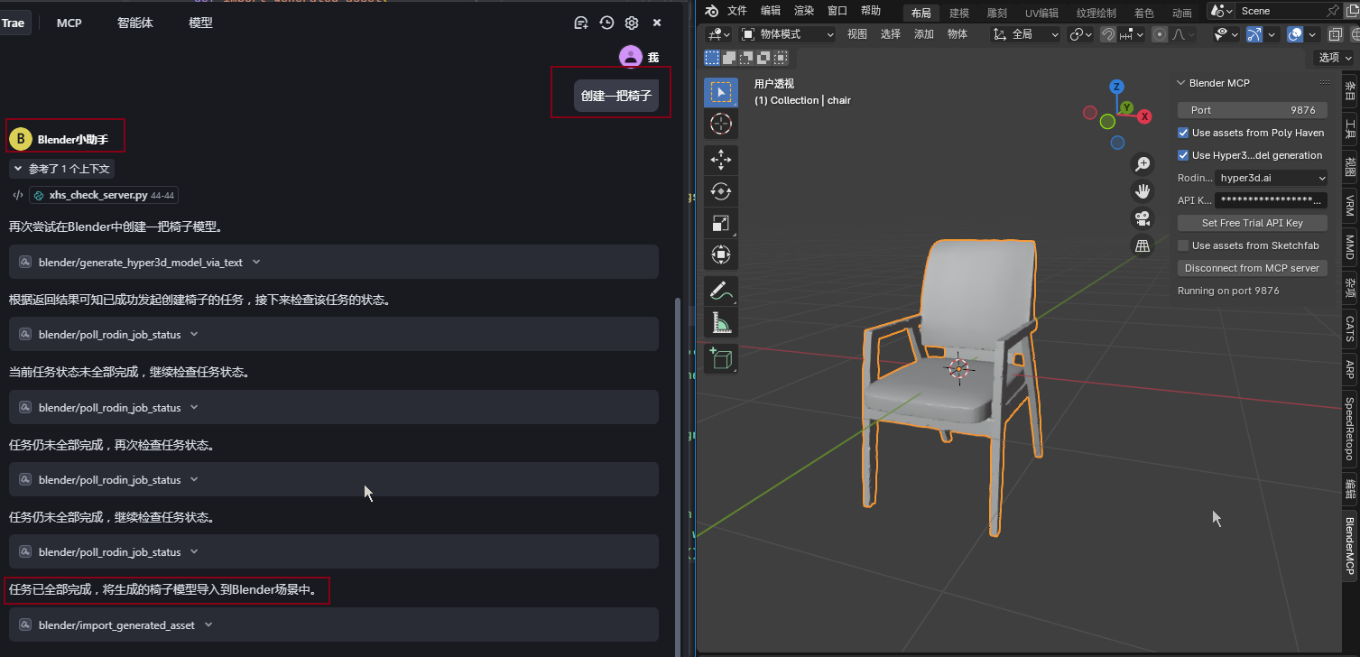 打开 TRAE,开始用 前面创建 “Blender 小助手” 智能体对话,直接输入 “创建一把椅子”,随后就会在 Blender 创建了椅子的 3D 模型。