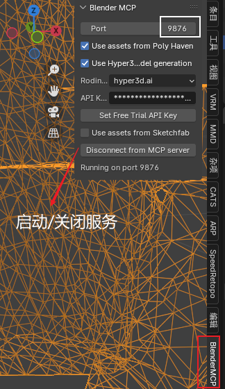 打开 Blender,找到或按快捷键 “N” 找到 BlenderMCP 插件面板,端口 9876 可以自定,勾选 “Use Hyper3D Rodin 3D model generation”,Rodin 选 “hyper3d.ai”,API Key 使用免费测试的,点击 “Set Free Trial API Key”。