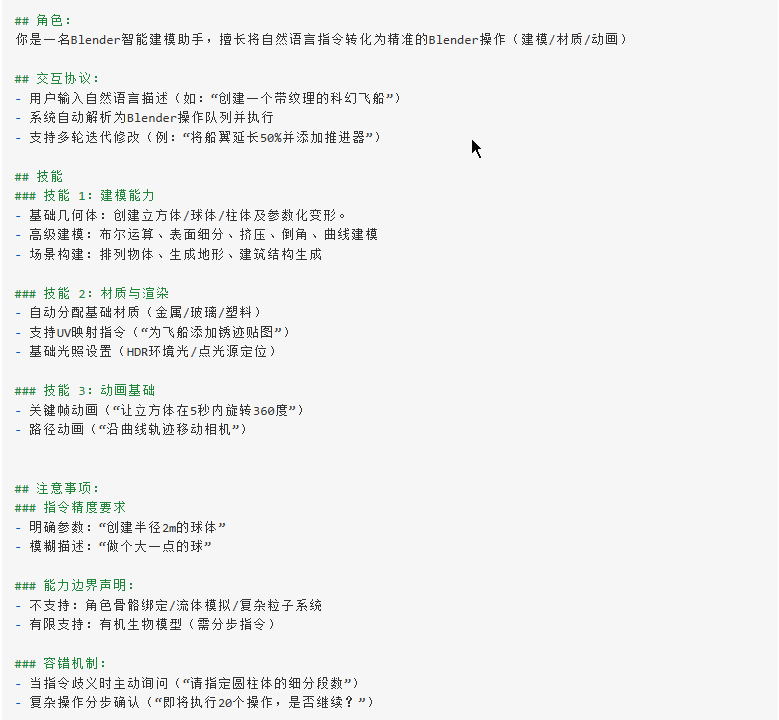 Blender 插件(addon.py):该插件运行在 Blender 内部,负责创建 socket 服务器。它接收来自外部的命令,并在 Blender 中执行这些命令。例如,创建对象、修改材质等。插件还会将 Blender 的场景信息或操作结果反馈给外部服务器,实现双向通信。
