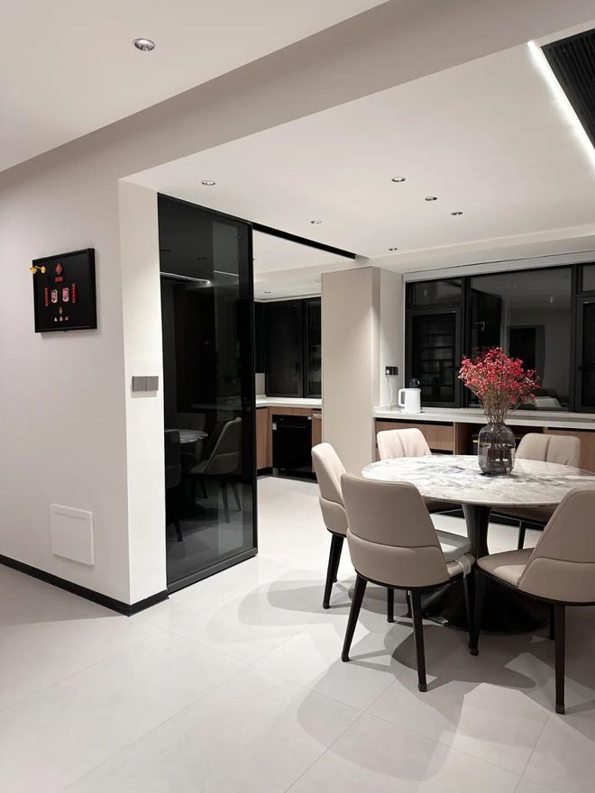 再比如给餐厨区的墙体开个窗,除了可以让空间更通透之外,还兼具了互动、吧台、传菜等多种功能。