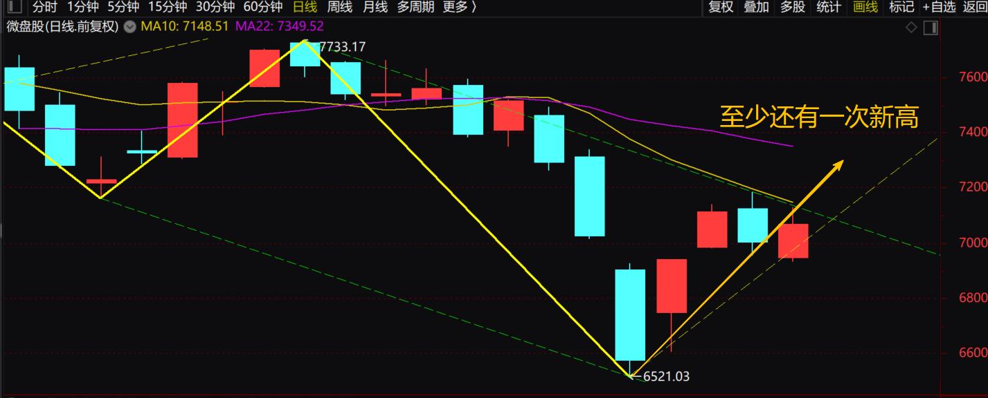 从技术周期来看,微盘股的调整时间,已经满足了日K一笔的最低要求(5天),接下来至少还有一次新高,来完成这一笔日K走势,内部结构咱们暂且不论,单从走势来看,微盘股大概率会冲击一次20日均线的位置。也就是说,接下来小票还有一波冲高的机会,大家不用因为今天的震荡就慌了神,盲目割肉在低位。