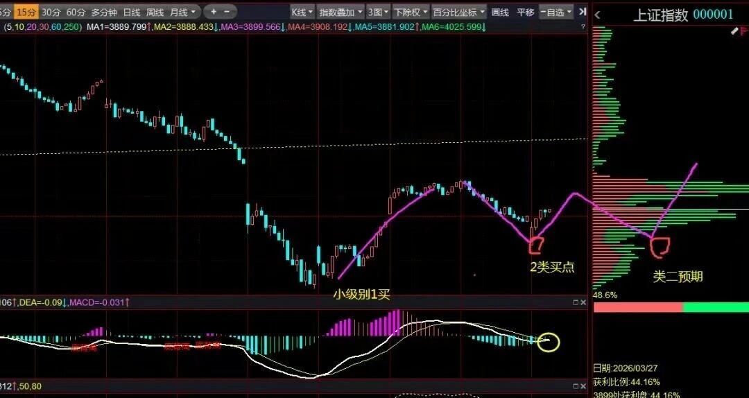先看今天的盘面细节,早盘低开之后,我们能明显看到护盘资金的动作,代表小盘股的黄色线全程在代表权重的白线之上,这就说明早盘的低开,根本不是新一轮下跌的开始,而是相对于3794点的小级别2类回踩买点,技术上也正好完成了15分钟macd回抽0轴的修复。