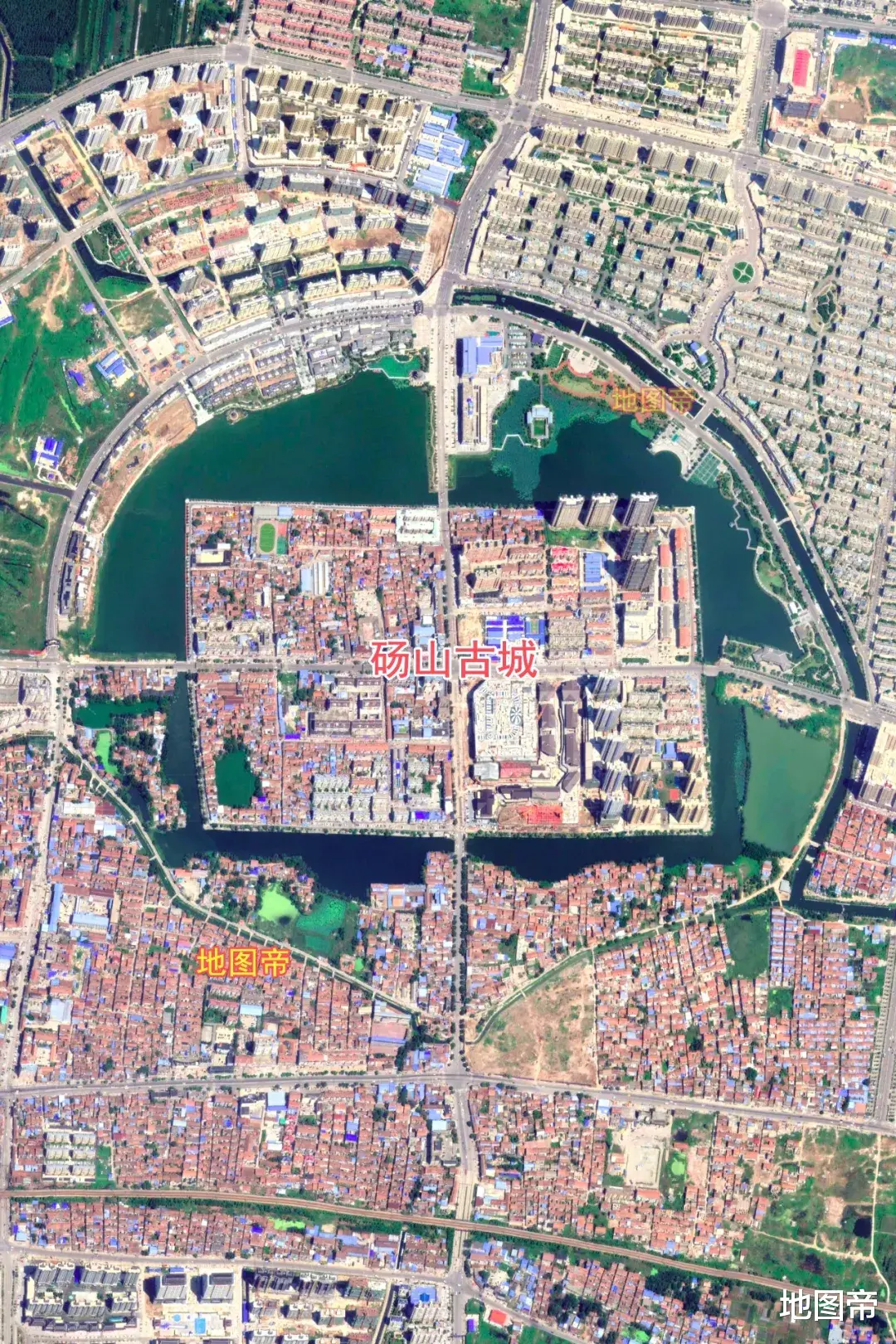 砀山古城,外圆内方,城墙呈方形,面积0.62平方千米,护城河呈圆形,面积1.6平方千米(环湖公路内)。砀山古城开四门:景云门(东),永保门(南),瑞洛门(西),企宁门(北)。