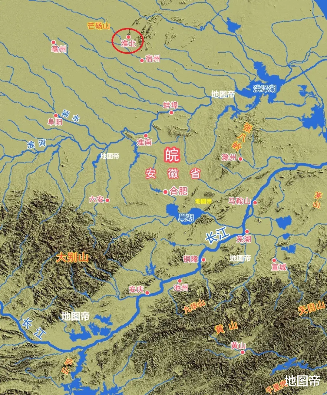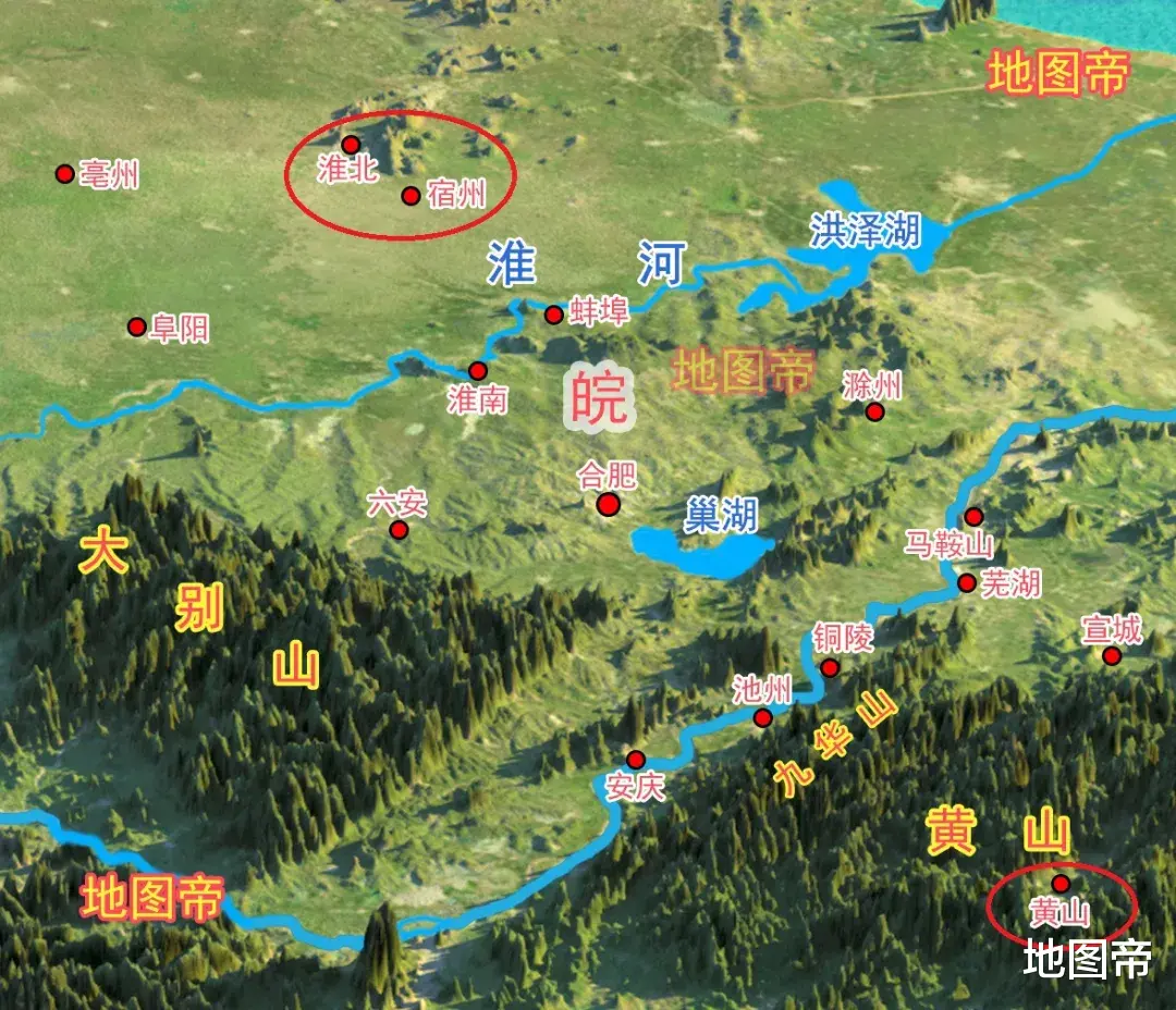 安徽北部的淮北、宿州、亳州属淮北,是暖温带半湿润季风气候,地形一马平川,典型的中原文化圈,方言为中原官话,主食以面食为主;南部的黄山属江南,是亚热带季风气候,地形山峦叠嶂,是徽州文化区,方言为徽语,主食以米饭为主。
