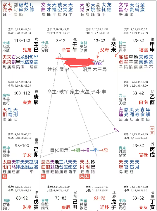 第一此盘文曲陷在命,必有情或财之问题,观其财帛乃太阳禄,这是重情薄财之相,迁移又有妻星,固此文曲陷之不顺之情,必不是钱财问题而是在感情,为何讲必有感情婚姻问题,答案还是在文曲星上,文曲是伐星,又得日月两星庙旺助持,固,此人必是一个报国安民讨伐贪腐之正义人士,普通人要成为一个这样的人,身边人会不会支持呢,很明显,配偶不支持,固有此陷之文曲。