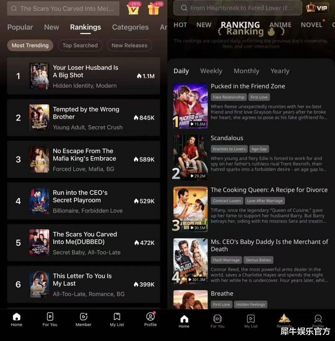我们观察了DramaBox、ReelShort英文版本的热门短剧排行榜单,目前高热项目还是集中于契约婚姻、身份反转、豪门继承、复仇逆袭等高转化题材。不过在这个基础上,现在许多高热项目也融入了狼人、校园、师生等更贴近欧美用户语境的设定。