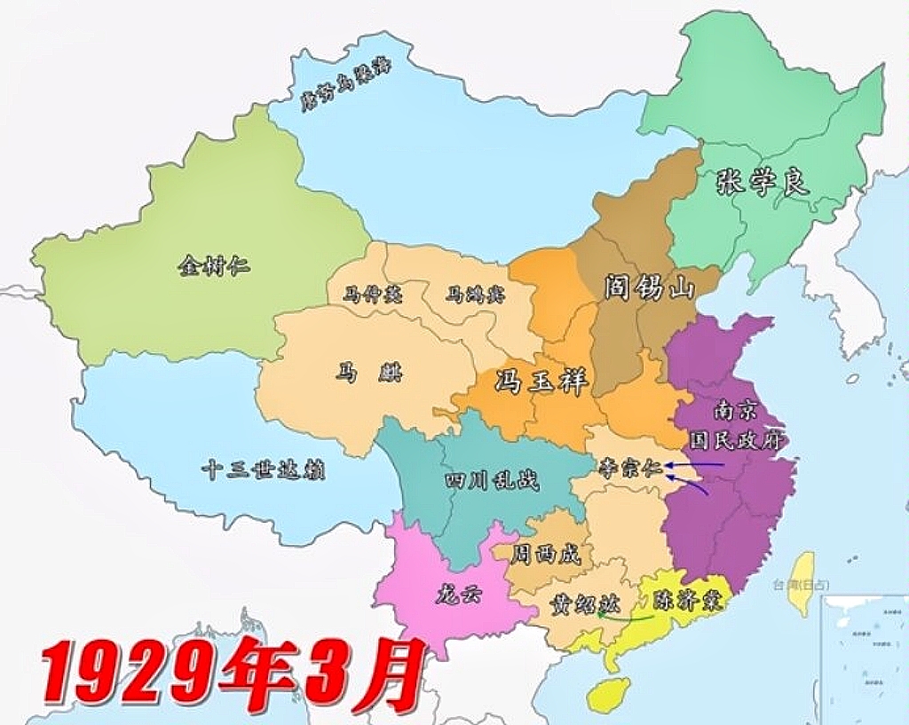 1928年,张作霖被关东军炸死,国民党没了外敌,蒋介石、冯玉祥、阎锡山、桂系割据一方,形成对峙局面。