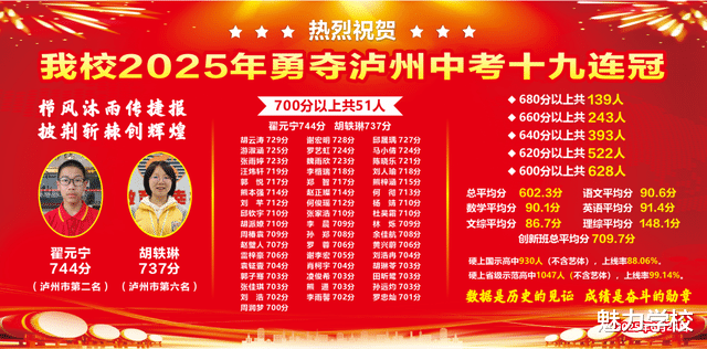 2025年,泸县二外梁才学校续写传奇,将泸州市中考十九连冠的辉煌收入囊中。这是学校“导航教育”理念的极致彰显,更是“一家人”同心同德、砥砺前行的有力证明。这份沉甸甸的成绩单,再次向社会证明了泸二外民办精品教育的卓越实力。