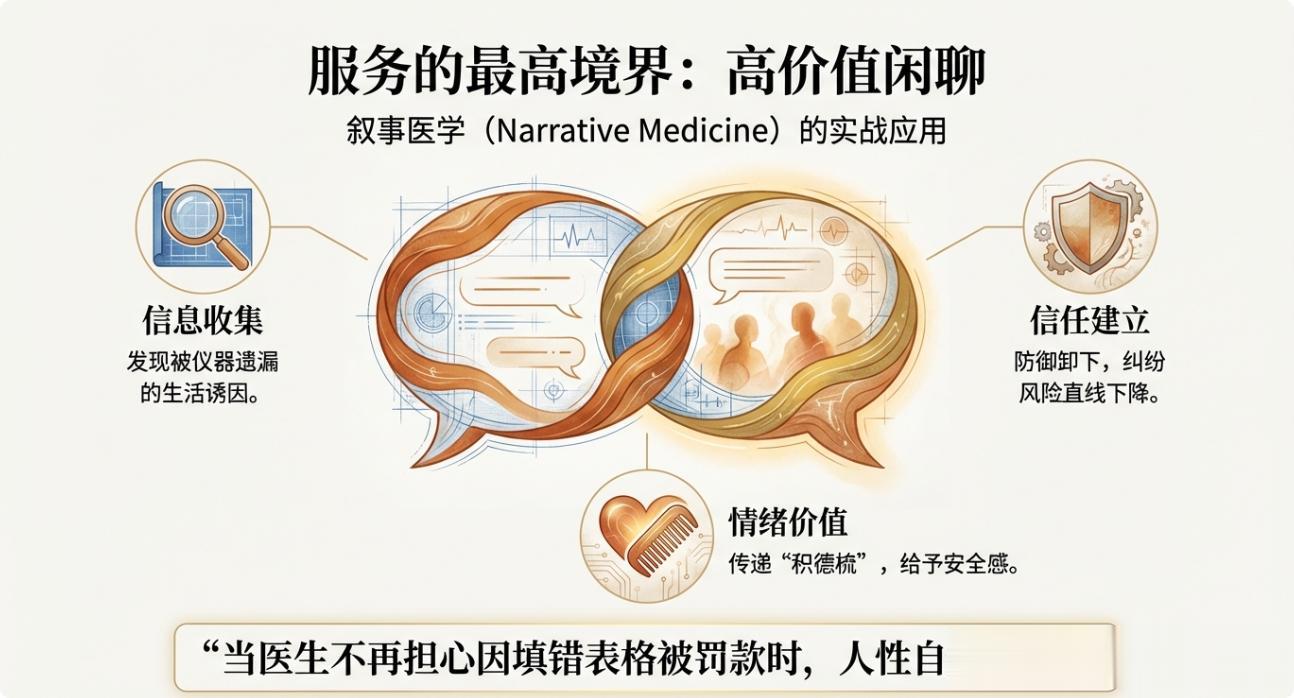三、 服务的本质:高价值的“闲聊”传说在梅奥,早期医生有大量时间与病人“聊天”。 请注意,这里的“聊天”不是摸鱼,而在医学社会学中被称为“叙事医学实践”。