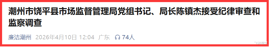 权力的光环一旦沾染私欲,终将坠入法纪的深渊。2026年清明假期刚过,粤东大地再传反腐强音。4月10日,据“廉洁潮州”权威发布,潮州市饶平县市场监督管理局党组书记、局长陈镇杰涉嫌严重违纪违法,目前正接受纪律审查和监察调查。这位身居县域经济监管核心岗位的“一把手”在任上落马,不仅撕开了当地市场监管领域潜在风险的一角,更再次印证了反腐败斗争无禁区、全覆盖、零容忍的坚定决心。