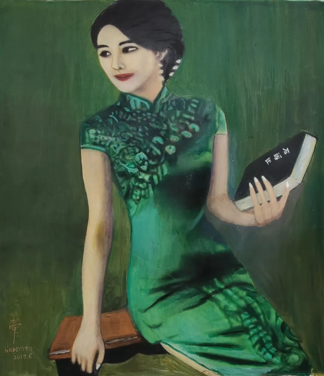 布面油畫,拿書少女104x97cm創作年代2019年6月