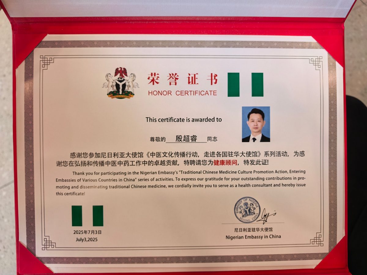 在重要的颁证仪式上,巴巴加纳・瓦基勒大使亲自为他颁发荣誉证书,特聘为尼日利亚驻华大使馆健康顾问,并与一同合影留念。这不仅是对他个人成就的高度肯定,更是对我国基层医疗工作的充分认可与尊重。会中,殷先生分享了自己的医疗特色与从医心得,以实际行动践行了铭记、传承和发扬中华中医传统文化的优势与使命。